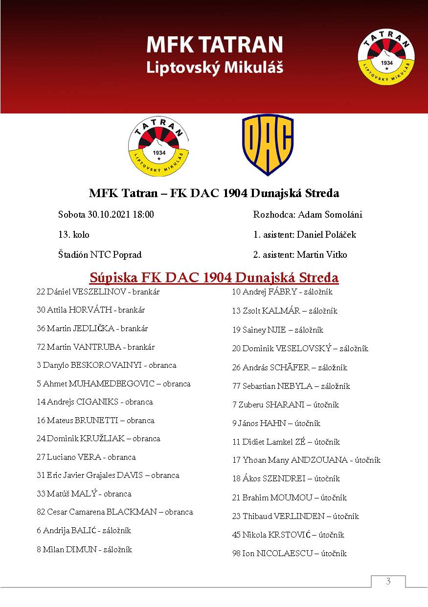 Oficiálna loptaPrinášame vám bulletin z 13. kola Fortuna ligy sezóny 2021/2022 proti DAC Dunajská Streda. Bulletin je možné si stiahnuť aj v PDF formáte pod článkom.