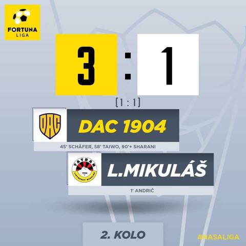 Po zmene strán si prvú streleckú príležitosť vytvorili hostia. Po rýchlej akcii Liptákov dostal loptu na ľavú stranu ihriska Kačerík, ktorý si ju potiahol na stred ihriska vystrelil, no jeho zakončenie bolo zblokované a lopta minula bránu Dunajskej Stredy. V 57. minúte išli domáci hráči prvýkrát v zápase o vedenia. Po krásnej akcii najprv Divković strelou opečiatkoval brvno, no v rozhodenej obrane hostí sa najrýchlejšie zorientoval Taiwo, ktorý z bezprostrednej blízkosti prekonal Lukscha. Hráči Liptovského Mikuláša neskladali zbrane a naďalej ukazovali, že chcú hrať futbal. V 62. minúte po pravej strane unikol Laura, ktorý si vymenil loptu s Adamom Krčíkom a následne odcentroval. Lopta v pokutovom území našla kapitána Bartoša, ale jeho zakončenie chýbala dostatočná razancia a brankár Dunajskej Stredy loptu poľahky schoval v náručí. Liptáci boli aj v druhom polčase nútení striedať kvôli zraneniu, keď na trávniku zostal po prudkom kontakte ležať Janec. V 87. minúte mohli Liptáci opäť vyrovnať stav stretnutia. Rohový kop z pravej strany zahrával Staš a v pokutovom území perfektne našiel Hranáča, ktorý zakončoval prudkou hlavičkou. Jedlička vytiahol neskutočný zákrok, s problémami loptu vyrazila a zachránil svoj tím pred inkasovaním gólu. Na konečných 3:1 upravil tesne pred záverom stretnutia Sharani, keď sa po ofenzíve hostí a následnej strate lopty dostal do úniku sám proti brankárovi a pohodlne prekonal Matěja Lukscha. MFK Tatran Liptovský Mikuláš si tak po ďalšom sympatickom výkone vo Fortuna lige bude musieť na prvé body do tabuľky ešte počkať.